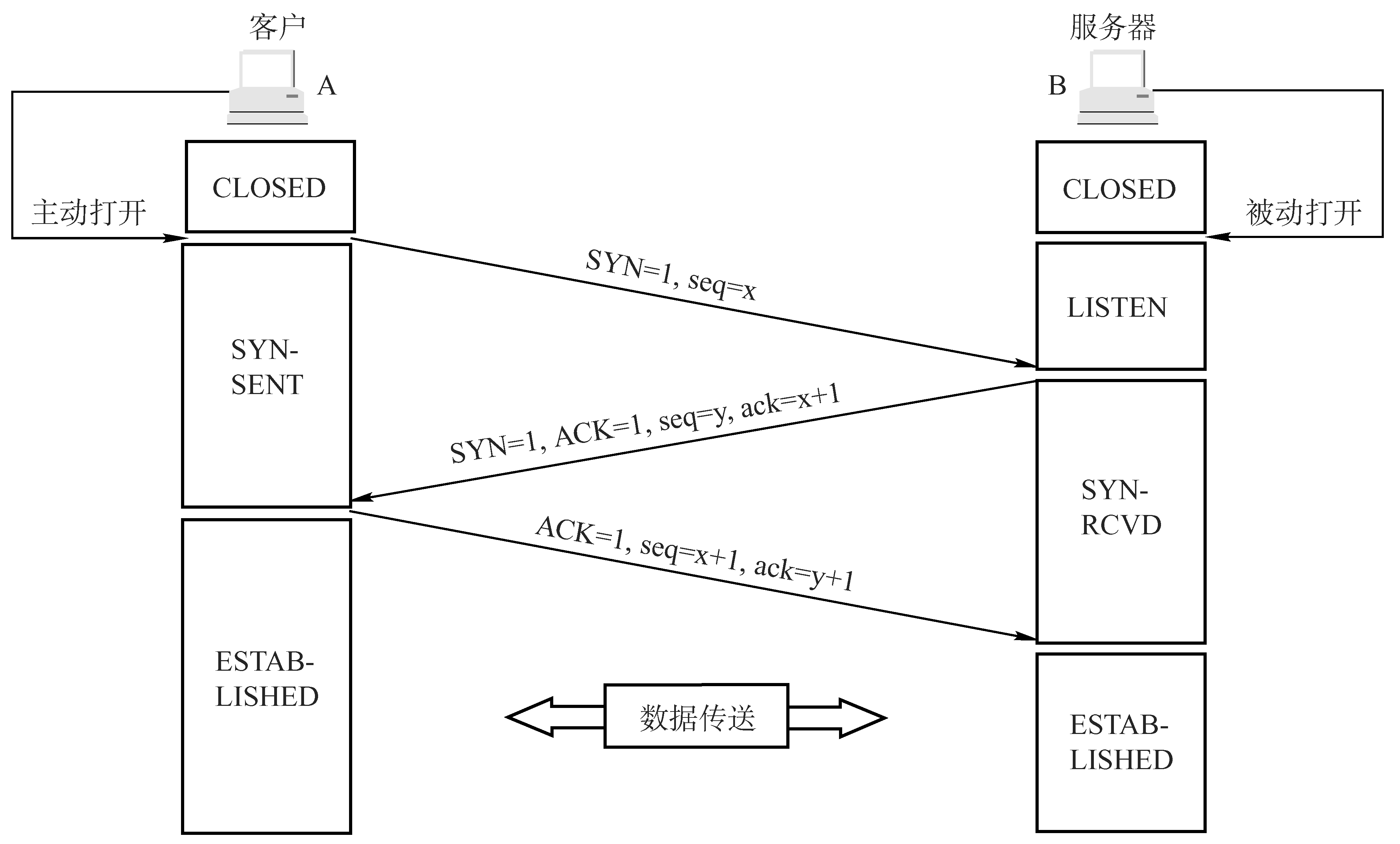 - SYN=1, ACK=1, seq=y[随机], ack=x+1